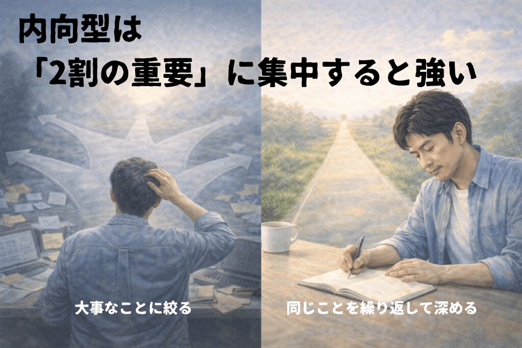 内向型は「2割の重要」に集中すると強い|広げるより深める働き方 公開日:2026年3月22日 内向型の生き方 内向型は広げるほど疲れやすく、深めるほど力を発揮しやすい特性があります。本記事では「2割の重要」に集中する働き方について、タクシーの実体験をもとに解説。無理なく続けられる仕事の整え方を紹介します。 続きを読む